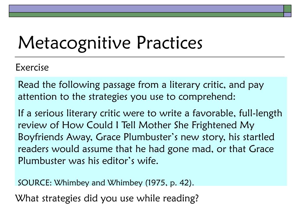 Exercise What strategies did you use while reading? Metacognitive Practices Read the following passage from a literary critic, and pay attention to the strategies you use to comprehend: If a serious literary critic were to write a favorable, full-length review of How Could I Tell Mother She Frightened My Boyfriends Away, Grace Plumbuster’s new story, his startled readers would assume that he had gone mad, or that Grace Plumbuster was his editor’s wife. SOURCE: Whimbey and Whimbey (1975, p. 42).