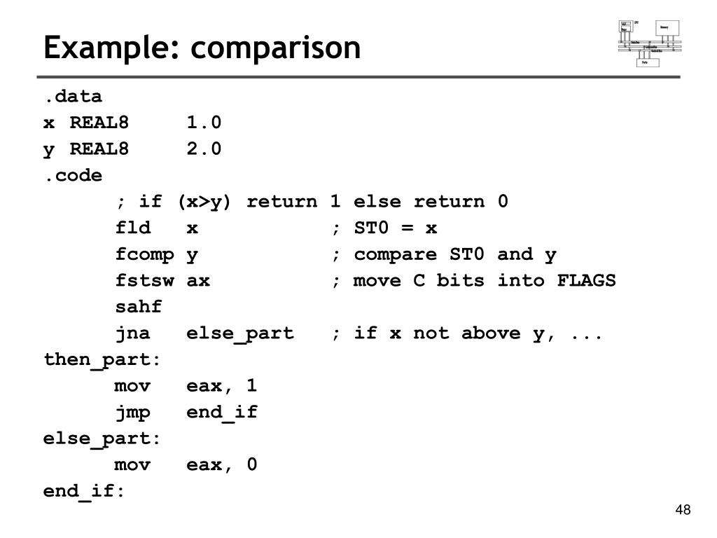 Example: comparison .data x REAL8 1.0 y REAL8 2.0 .code ; if (x>y) return 1 else return 0 fld x ; ST0 = x fcomp y ; compare ST0 and y fstsw ax ; move C bits into FLAGS sahf jna else_part ; if x not above y, ... then_part: mov eax, 1 jmp end_if else_part: mov eax, 0 end_if: