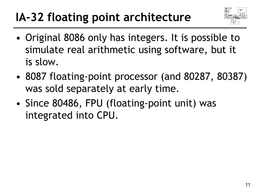 IA-32 floating point architecture • Original 8086 only has integers. It is possible to simulate real arithmetic using software, but it is slow. • 8087 floating-point processor (and 80287, 80387) was sold separately at early time. • Since 80486, FPU (floating-point unit) was integrated into CPU.