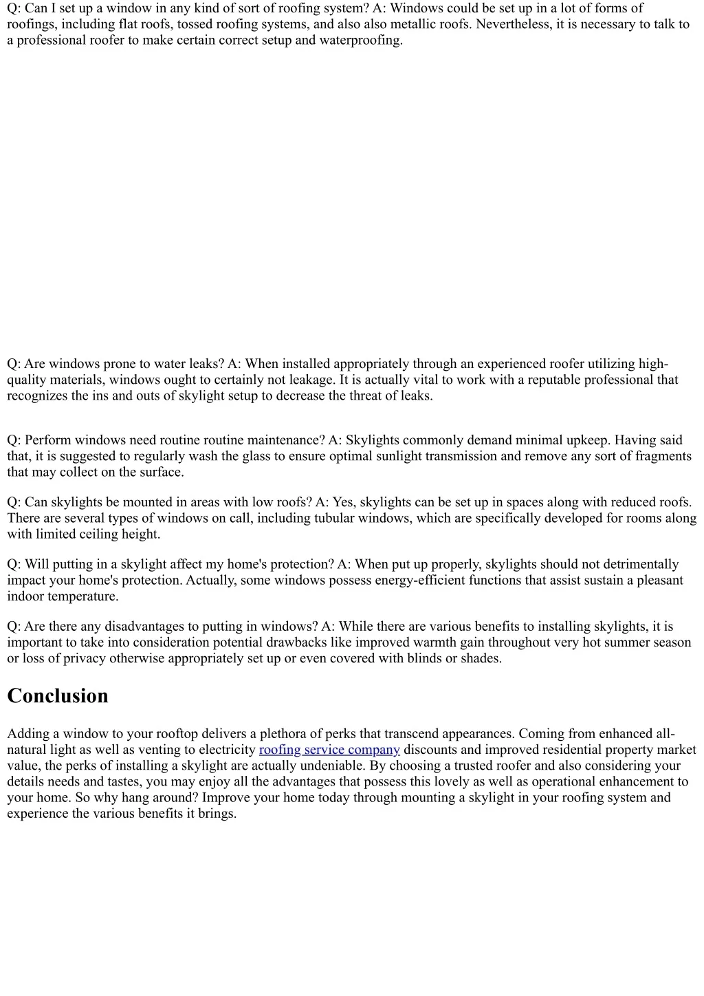 Q: Can I set up a window in any kind of sort of roofing system? A: Windows could be set up in a lot of forms of roofings, including flat roofs, tossed roofing systems, and also also metallic roofs. Nevertheless, it is necessary to talk to a professional roofer to make certain correct setup and waterproofing. Q: Are windows prone to water leaks? A: When installed appropriately through an experienced roofer utilizing high- quality materials, windows ought to certainly not leakage. It is actually vital to work with a reputable professional that recognizes the ins and outs of skylight setup to decrease the threat of leaks. Q: Perform windows need routine routine maintenance? A: Skylights commonly demand minimal upkeep. Having said that, it is suggested to regularly wash the glass to ensure optimal sunlight transmission and remove any sort of fragments that may collect on the surface. Q: Can skylights be mounted in areas with low roofs? A: Yes, skylights can be set up in spaces along with reduced roofs. There are several types of windows on call, including tubular windows, which are specifically developed for rooms along with limited ceiling height. Q: Will putting in a skylight affect my home's protection? A: When put up properly, skylights should not detrimentally impact your home's protection. Actually, some windows possess energy-efficient functions that assist sustain a pleasant indoor temperature. Q: Are there any disadvantages to putting in windows? A: While there are various benefits to installing skylights, it is important to take into consideration potential drawbacks like improved warmth gain throughout very hot summer season or loss of privacy otherwise appropriately set up or even covered with blinds or shades. Conclusion Adding a window to your rooftop delivers a plethora of perks that transcend appearances. Coming from enhanced all- natural light as well as venting to electricity roofing service company discounts and improved residential property market value, the perks of installing a skylight are actually undeniable. By choosing a trusted roofer and also considering your details needs and tastes, you may enjoy all the advantages that possess this lovely as well as operational enhancement to your home. So why hang around? Improve your home today through mounting a skylight in your roofing system and experience the various benefits it brings.