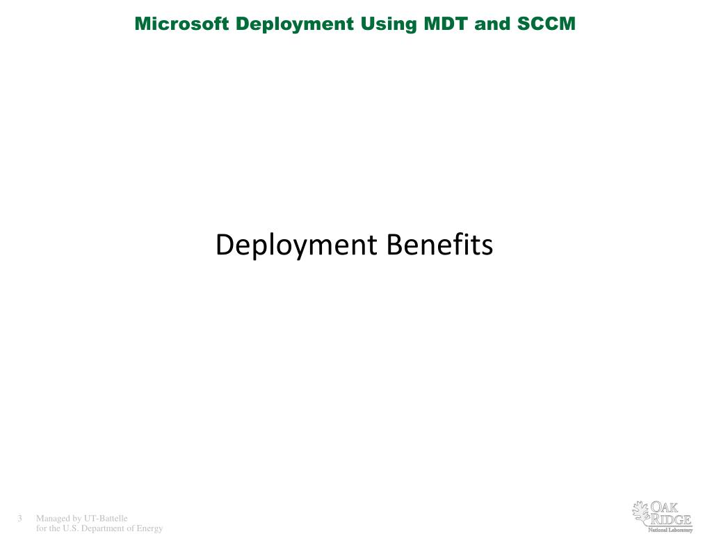 Microsoft Deployment Using MDT and SCCM Introduction • Presentation Focus • Something for everyone • Extension from last years presentation on MDT • Deployment Benefits • ORNL History and Environment • ORNL Deployment Philosophies • Microsoft Desktop Deployment (MDT) and System Center Configuration Manager (SCCM) at ORNL