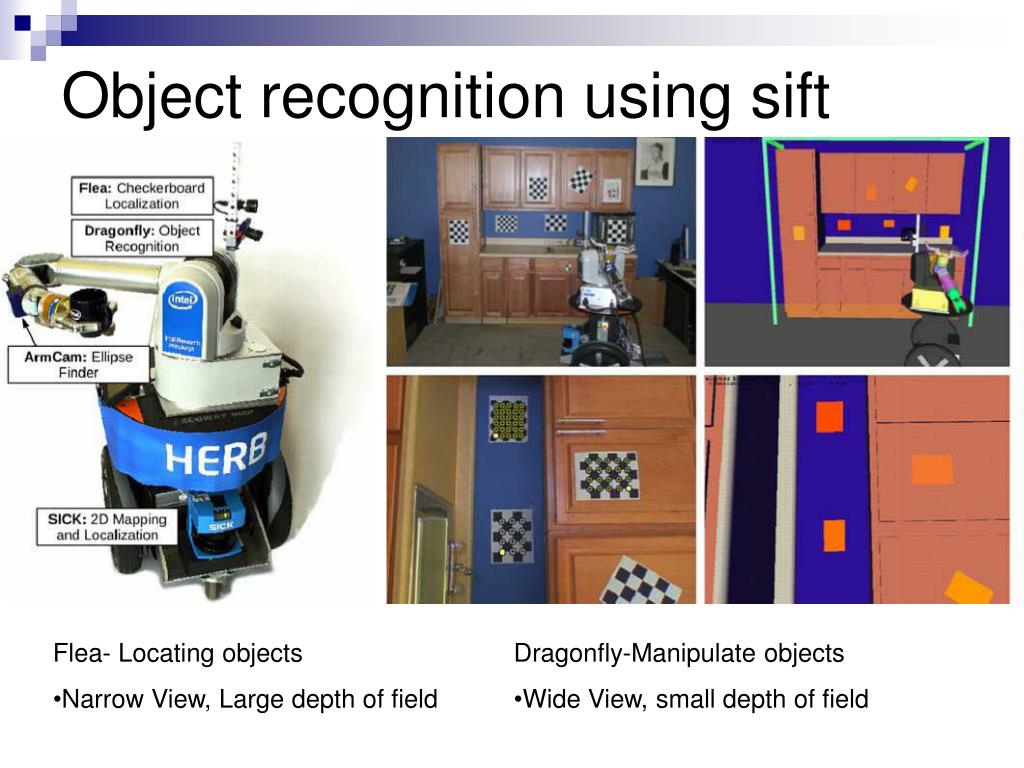 Object recognition using sift • Flea- Locating objects • Narrow View, Large depth of field • Dragonfly-Manipulate objects • Wide View, small depth of field
