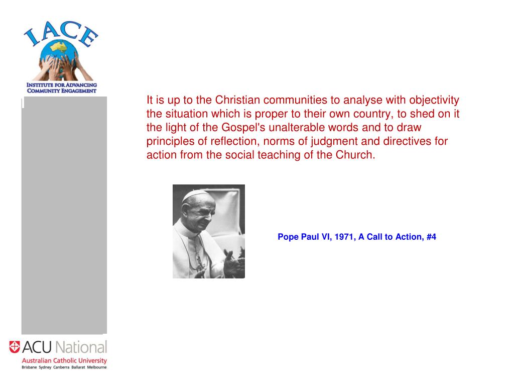 It is up to the Christian communities to analyse with objectivity the situation which is proper to their own country, to shed on it the light of the Gospel's unalterable words and to draw principles of reflection, norms of judgment and directives for action from the social teaching of the Church.Pope Paul VI, 1971, A Call to Action, #4