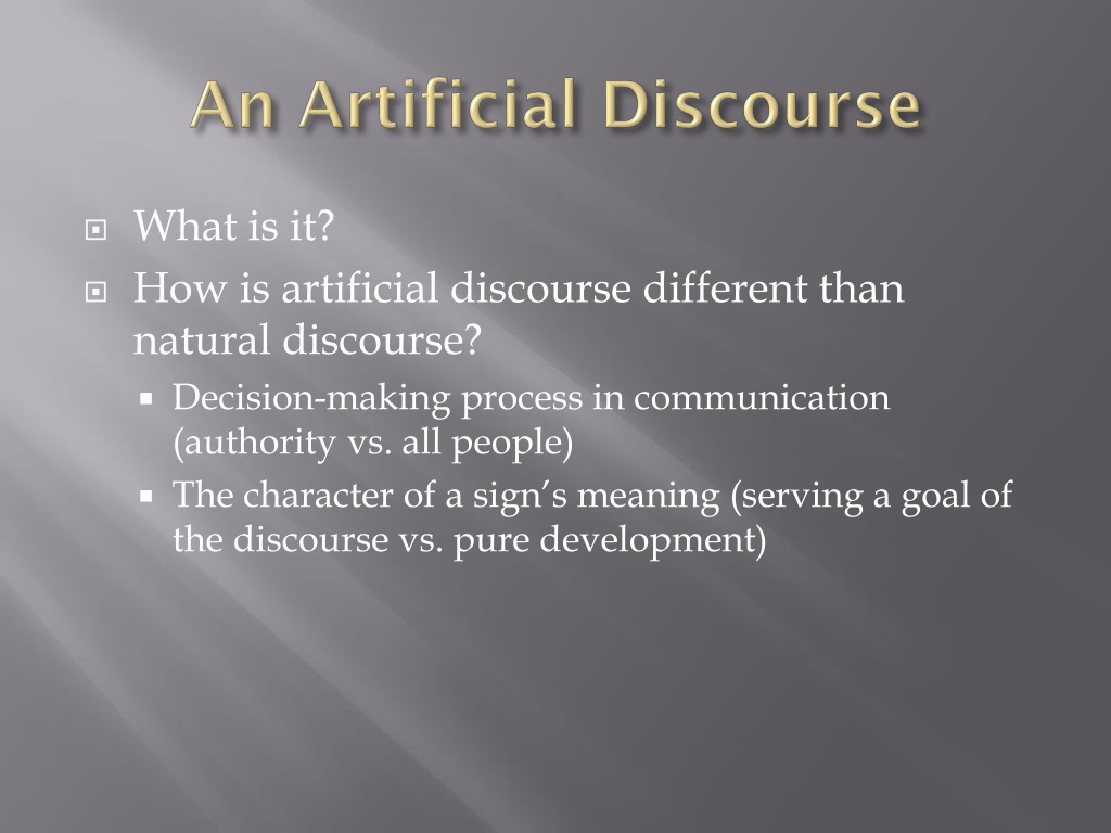 An Artificial Discourse • What is it? • How is artificial discourse different than natural discourse? • Decision-making process in communication (authority vs. all people) • The character of a sign’s meaning (serving a goal of the discourse vs. pure development)