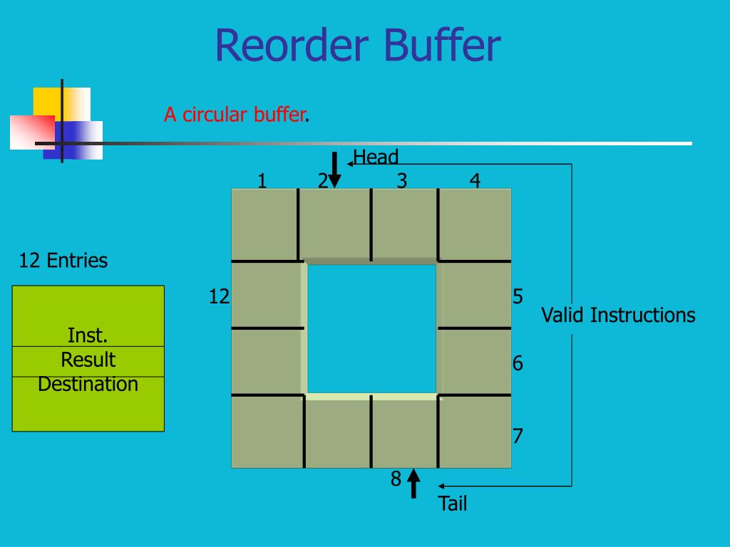 Head 1 2 3 4 12 Entries 12 5 Inst. Result Destination Valid Instructions 6 7 8 Tail Reorder Buffer A circular buffer.