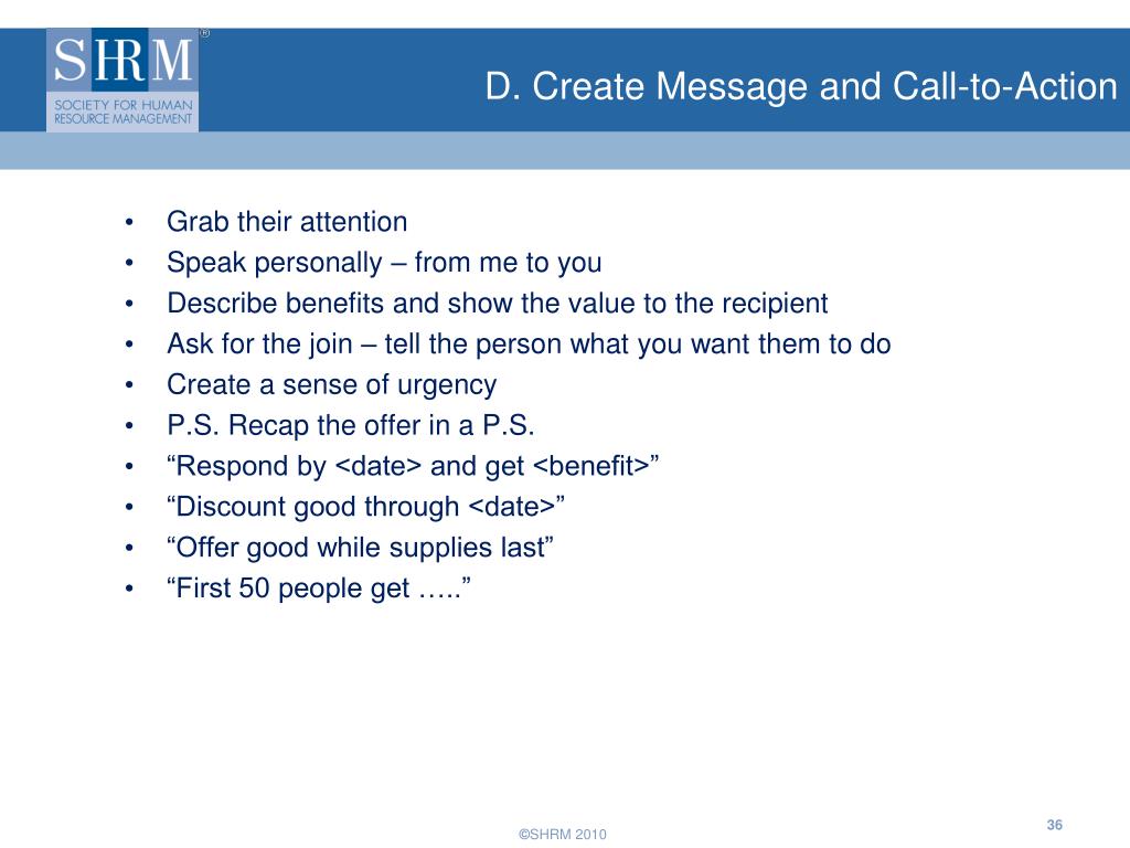 D. Create Message and Call-to-Action • Grab their attention • Speak personally – from me to you • Describe benefits and show the value to the recipient • Ask for the join – tell the person what you want them to do • Create a sense of urgency • P.S. Recap the offer in a P.S. • “Respond by <date> and get <benefit>” • “Discount good through <date>” • “Offer good while supplies last” • “First 50 people get …..”