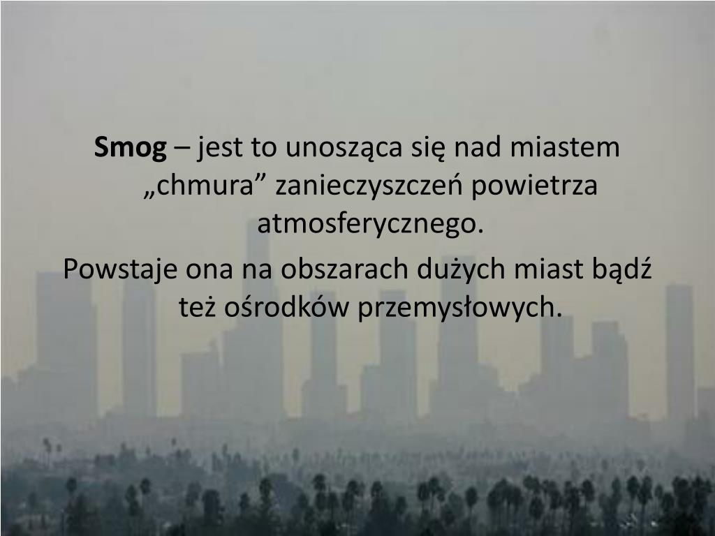 Smog. Smog – jest to unosząca się nad miastem „chmura” zanieczyszczeń powietrza atmosferycznego. Powstaje ona na obszarach dużych miast bądź też ośrodków przemysłowych. Smog składa się z pyłów i gazów pochodzących