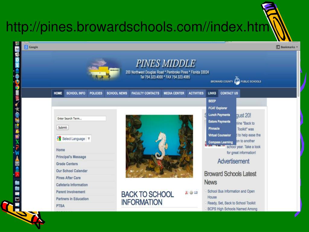 Pinnacle Grades • You can see your child’s grades at any time by going on Pinnacle. Visit the http://pines.browardschools.comwebsite, scroll down and look on the right side of the page and click on the Pinnacle Grade viewer link. • User name is the 10-digit student number • Password is the child’s 4-digit year of birth, then the 2-digit month, then the 2-digit day (example: 19940927) • Select Pines Middle • You will be able to view a report card type summary of grades, and look at individual class grade books (You can also E-mail all of your child’s teachers within the Pinnacle grade book)