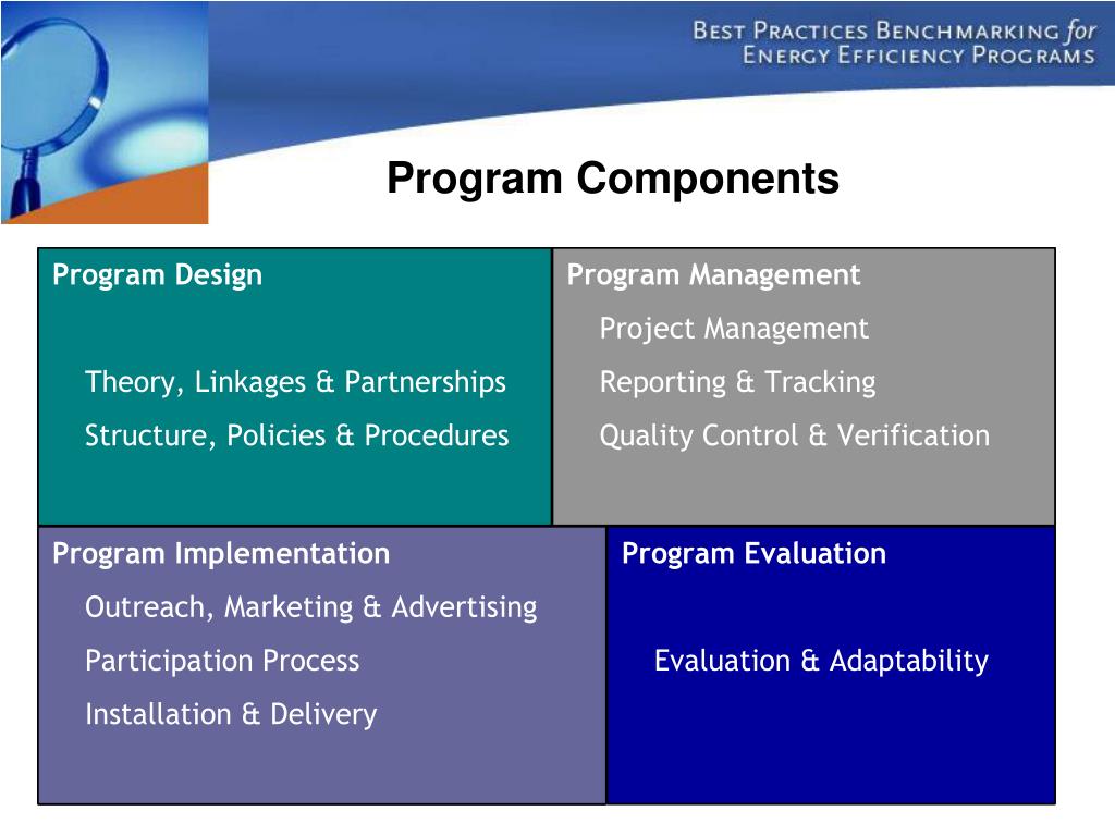 What Makes a Program? Program outcome is a function of changeable program components and changeable and unchangeable context variables. Outcome Metrics Cost-effectiveness Sustainability Participation Rates Market Effects Context Variables Program Design Policy Elements Socio-Economic and other immutable factors Program Outcome Changeable Program Elements Changeable and Unchangeable Contextual Environment + = Changeable Program Components Design Implementation Management Evaluation