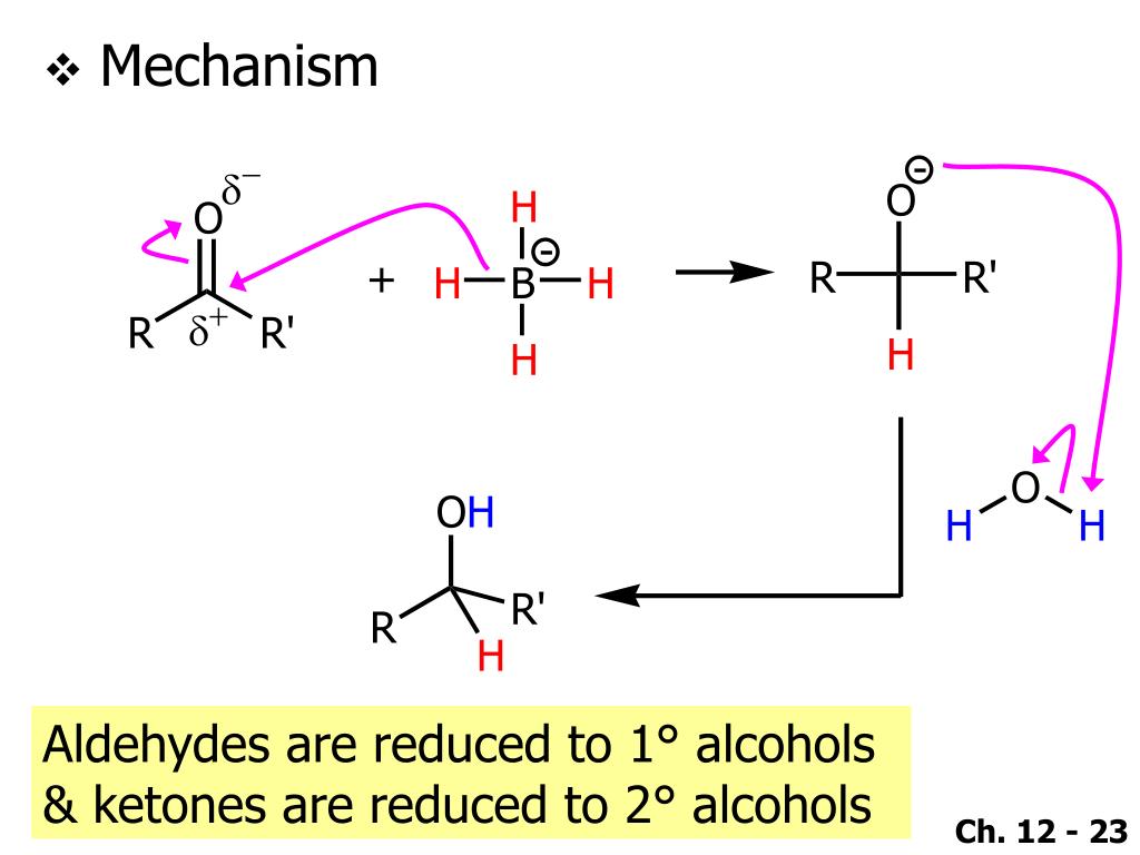 Mechanism Aldehydes are reduced to 1° alcohols & ketones are reduced to 2° alcohols