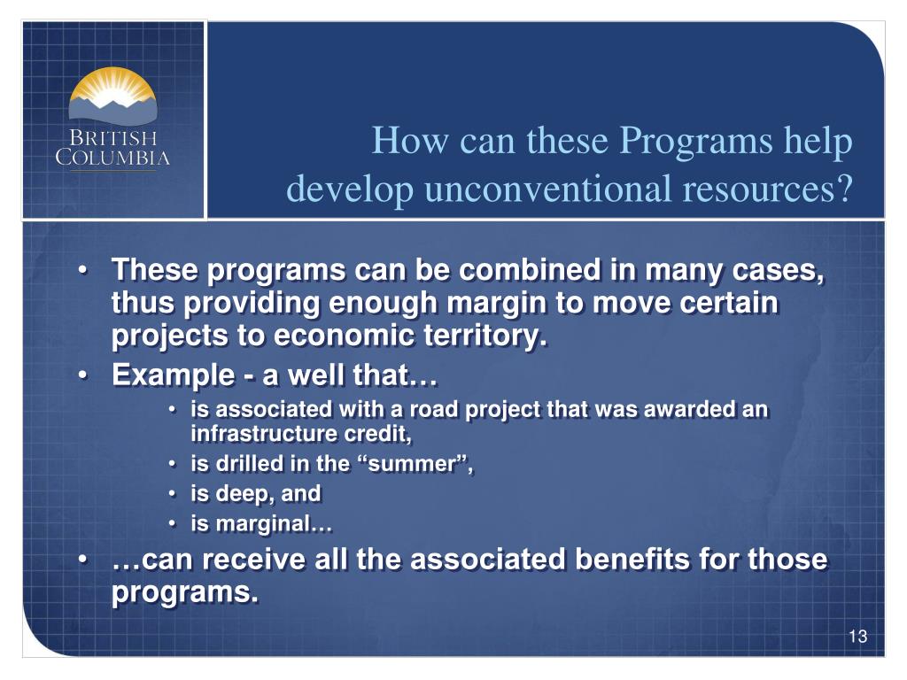 How can these Programs help develop unconventional resources? • These programs can be combined in many cases, thus providing enough margin to move certain projects to economic territory. • Example - a well that… • is associated with a road project that was awarded an infrastructure credit, • is drilled in the “summer”, • is deep, and • is marginal… • …can receive all the associated benefits for those programs.