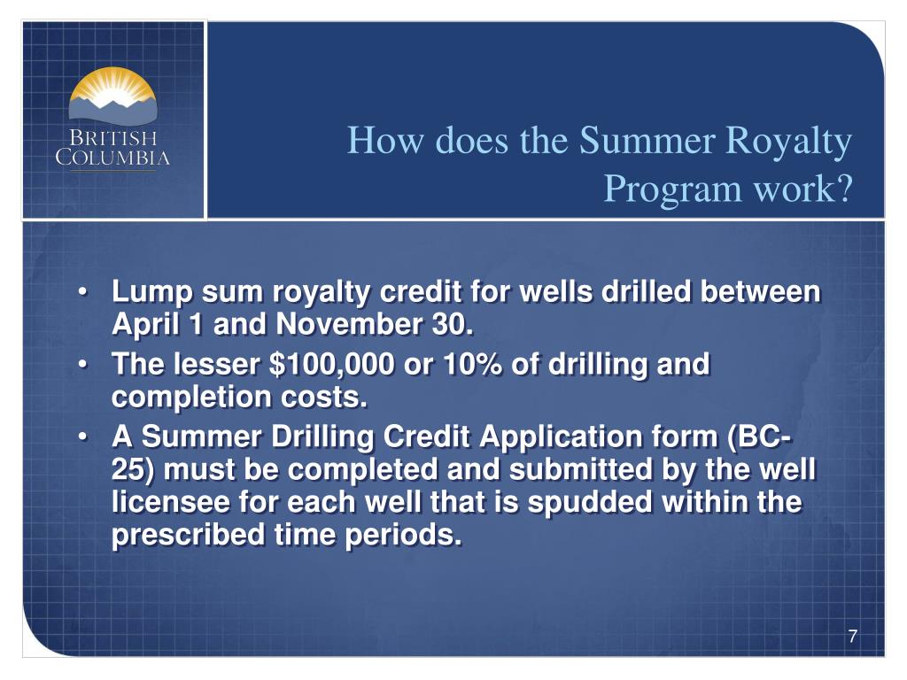 How does the Summer Royalty Program work? • Lump sum royalty credit for wells drilled between April 1 and November 30. • The lesser $100,000 or 10% of drilling and completion costs. • A Summer Drilling Credit Application form (BC-25) must be completed and submitted by the well licensee for each well that is spudded within the prescribed time periods.
