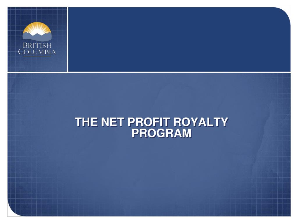 Net Profit Concept • Net Profit royalty eligibility determined through a Request for Applications (RFA) process • Province approves projects • Project location within BC • Type of project to be sponsored • Project Boundaries (Net Profit Ring Fence) • Geographic area around a project • Approved by the Province • No other royalty regime applies within the Net Profit Ring Fence