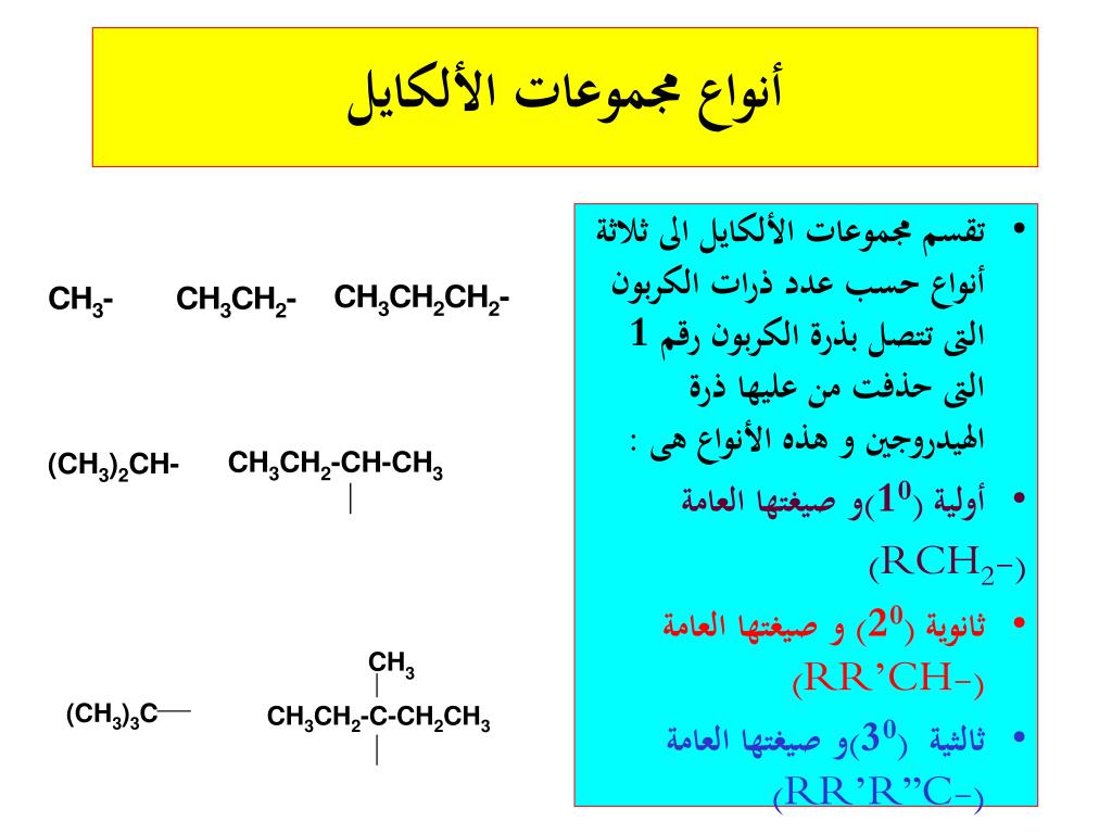 29. أما أذا تم حذف ذرة هدروجين مرتبطة بذرة كربون غير طرفية فى ألكان يحتوى على أكثر من ذرتين كربون عندئذ يمكن تمثيل مجموعة الألكايل الناتجة كما فى الشكل : • حيث (R) و (R’) قد تكون متساويتين فى عدد ذرات الكربون أو غير متساويتين .وفى هذة الحالة نعتبر المجموعة التى بها ذرات كربون أقل مجموعة ألكايل فرعية و المجموعة الأخرى ومعها ذرة الكربون رقم واحد هى المجموعة الأصلية .بعد ذلك يشتق أسم المجموعة ككل بكتابة رقم (1) يليه أسم مجموعة الألكايل الفرعية و لتكن (R’) ثم أسم مجموعة الألكايل الأصلية (RCH-) .