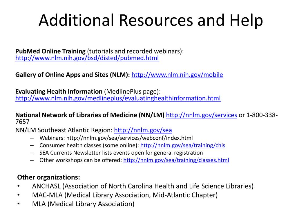 Additional Resources and Help PubMed Online Training (tutorials and recorded webinars): http://www.nlm.nih.gov/bsd/disted/pubmed.html Gallery of Online Apps and Sites (NLM): http://www.nlm.nih.gov/mobile Evaluating Health Information (MedlinePlus page): http://www.nlm.nih.gov/medlineplus/evaluatinghealthinformation.html National Network of Libraries of Medicine (NN/LM) http://nnlm.gov/servicesor 1-800-338-7657 NN/LM Southeast Atlantic Region: http://nnlm.gov/sea • Webinars: http://nnlm.gov/sea/services/webconf/index.html • Consumer health classes (some online): http://nnlm.gov/sea/training/chis • SEA Currents Newsletter lists events open for general registration • Other workshops can be offered: http://nnlm.gov/sea/training/classes.html Other organizations: • ANCHASL (Association of North Carolina Health and Life Science Libraries) • MAC-MLA (Medical Library Association, Mid-Atlantic Chapter) • MLA (Medical Library Association)
