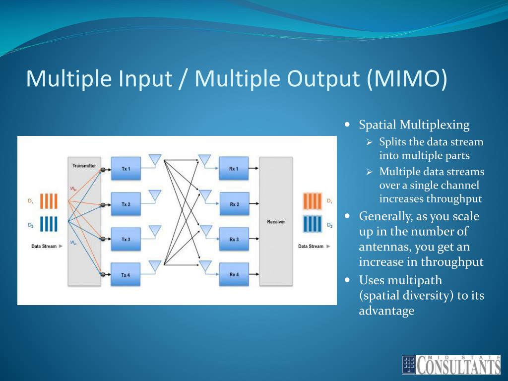 Multiple Input / Multiple Output (MIMO) • Spatial Multiplexing • Splits the data stream into multiple parts • Multiple data streams over a single channel increases throughput • Generally, as you scale up in the number of antennas, you get an increase in throughput • Uses multipath (spatial diversity) to its advantage