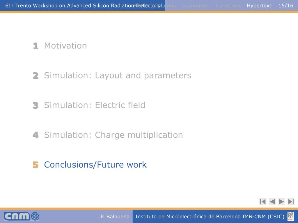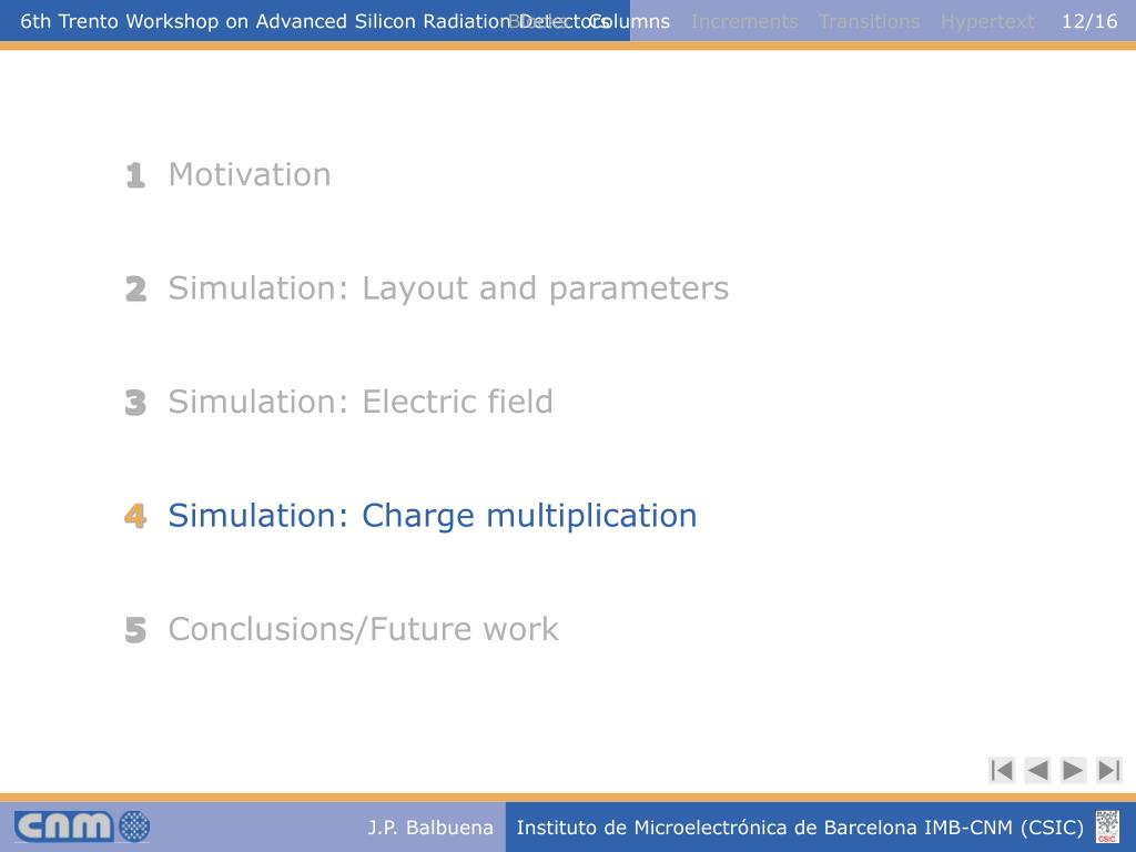 Blocks Columns Increments Transitions Hypertext 1Motivation 2Simulation: Layout and parameters 3Simulation: Electric field 4 Simulation: Charge multiplication 5 Conclusions/Future work