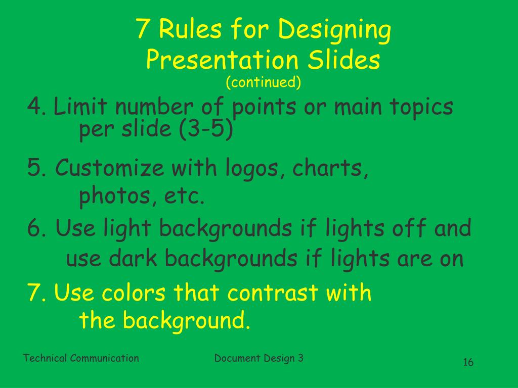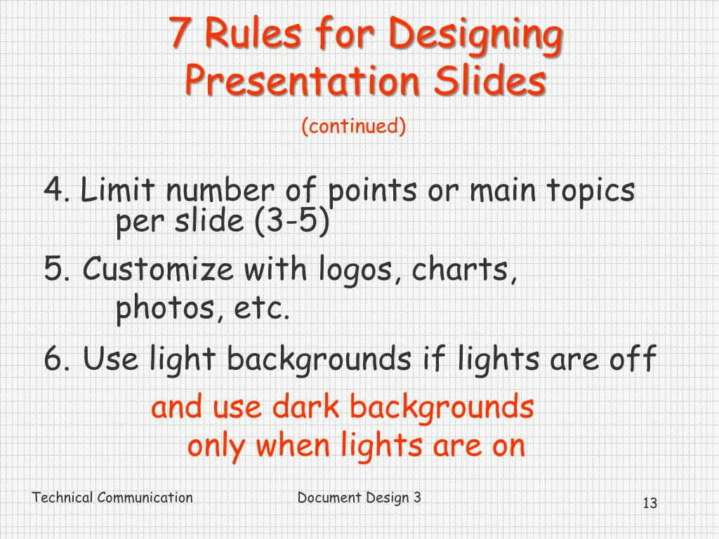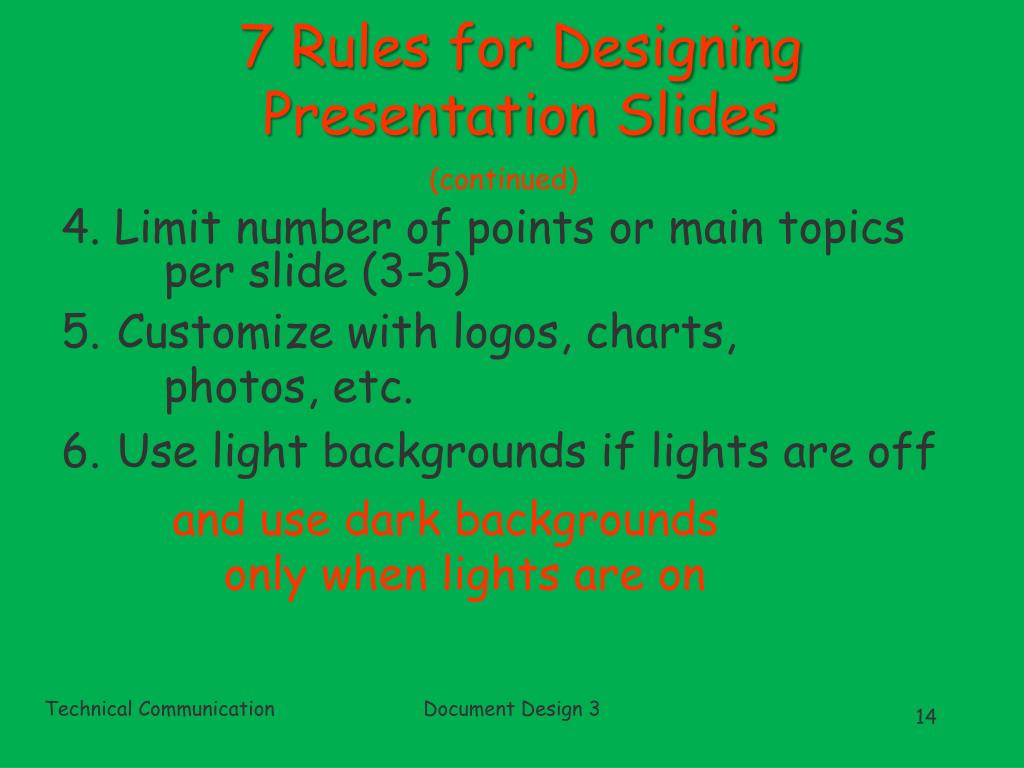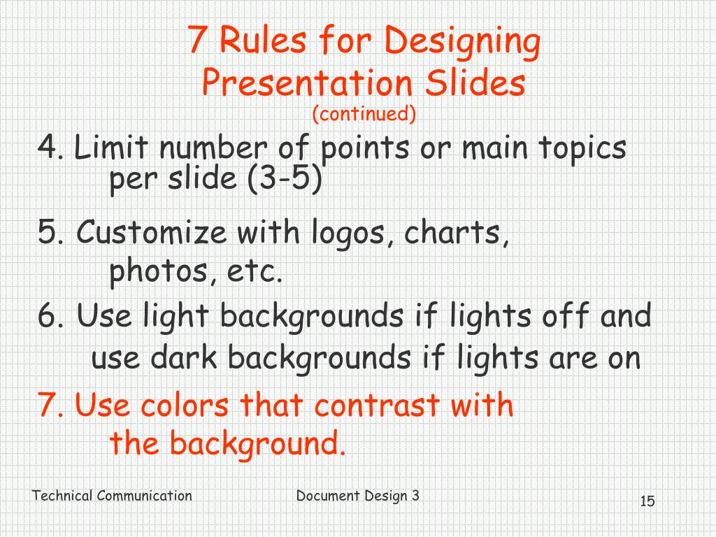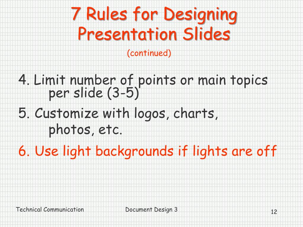7 Rules for DesigningPresentation Slides (continued) 4. Limit number of points or main topics per slide (3-5) • Customize with logos, charts, photos, etc. • Use light backgrounds if lights are off Document Design 3