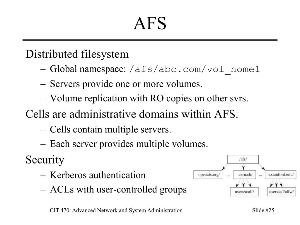 AFS Distributed filesystem • Global namespace: /afs/abc.com/vol_home1 • Servers provide one or more volumes. • Volume replication with RO copies on other svrs. Cells are administrative domains within AFS. • Cells contain multiple servers. • Each server provides multiple volumes. Security • Kerberos authentication • ACLs with user-controlled groups CIT 470: Advanced Network and System Administration