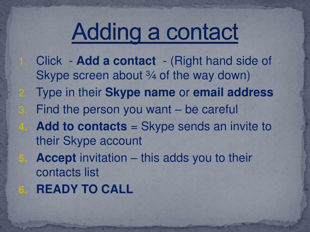 Adding a contact • Click - Add a contact - (Right hand side of Skype screen about ¾ of the way down) • Type in their Skype name or email address • Find the person you want – be careful • Add to contacts = Skype sends an invite to their Skype account • Accept invitation – this adds you to their contacts list • READY TO CALL