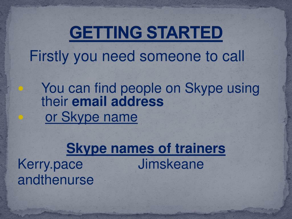 GETTING STARTED Firstly you need someone to call • You can find people on Skype using their email address • or Skype name Skype names of trainers Kerry.paceJimskeane andthenurse