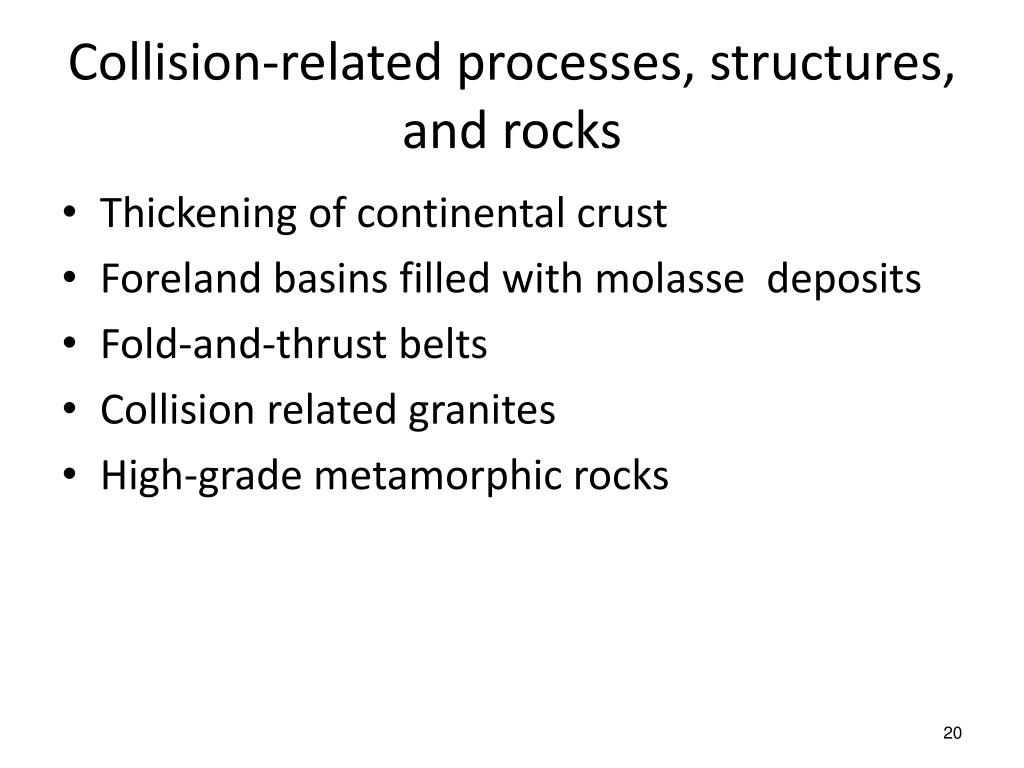 Collision-related processes, structures, and rocks • Thickening of continental crust • Foreland basins filled with molasse deposits • Fold-and-thrust belts • Collision related granites • High-grade metamorphic rocks