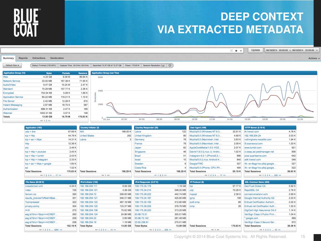 Multi-dimensional analysis • Application • Application Group • Email Recipient • Email Sender • Email Subject • SSL Common Name • File Name • Fuzzy Hash • MD5 Hash • MIME Type • SHA1 Hash • VLAN ID • VoIP ID • Country Initiator • Country Responder • DNS Query • Ethernet Destination • Ethernet Destination Vendors • Ethernet Protocol • Ethernet Source • Ethernet Source Vendors • Interface • IP Bad Checksums • IP Fragments • IP Protocol • IPv4 Conversation • IPv4 Responder • IPv4 Initiator • IPv4 Port Conversation • IPv6 Conversation • IPv6 Initiator • IPv6 Responder • IPv6 Port Conversation • Packet Length • Port Initiator • Port Responder • Size in Bytes • Size in Packets • TCP Initiator • TCP Responder • Tunnel Initiator • Tunnel Responder • UDP Initiator • UDP Responder • Password • Social Persona • User Name • File Analysis • Malware Analysis • URL Analysis • URL Categories • Database Query • HTTP Code • HTTP Content Disposition • HTTP Forward Address • HTTP Method • HTTP Server • HTTP URI • Referrer • SSL Cert Number • User Agent • Web Query • Web Server