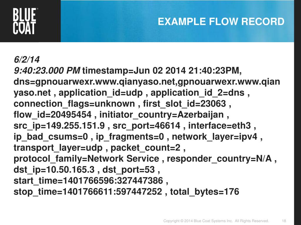 Example flow record 6/2/149:40:23.000 PM timestamp=Jun 02 2014 21:40:23PM, dns=gpnouarwexr.www.qianyaso.net,gpnouarwexr.www.qianyaso.net , application_id=udp , application_id_2=dns , connection_flags=unknown , first_slot_id=23063 , flow_id=20495454 , initiator_country=Azerbaijan , src_ip=149.255.151.9 , src_port=46614 , interface=eth3 , ip_bad_csums=0 , ip_fragments=0 , network_layer=ipv4 , transport_layer=udp , packet_count=2 , protocol_family=Network Service , responder_country=N/A , dst_ip=10.50.165.3 , dst_port=53 , start_time=1401766596:327447386 , stop_time=1401766611:597447252 , total_bytes=176