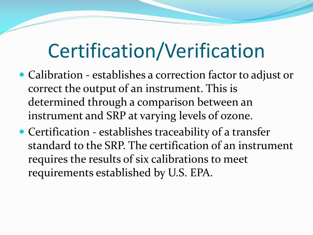 Certification/Verification • Calibration - establishes a correction factor to adjust or correct the output of an instrument. This is determined through a comparison between an instrument and SRP at varying levels of ozone. • Certification - establishes traceability of a transfer standard to the SRP. The certification of an instrument requires the results of six calibrations to meet requirements established by U.S. EPA.
