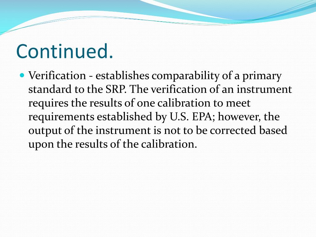Continued. • Verification - establishes comparability of a primary standard to the SRP. The verification of an instrument requires the results of one calibration to meet requirements established by U.S. EPA; however, the output of the instrument is not to be corrected based upon the results of the calibration.
