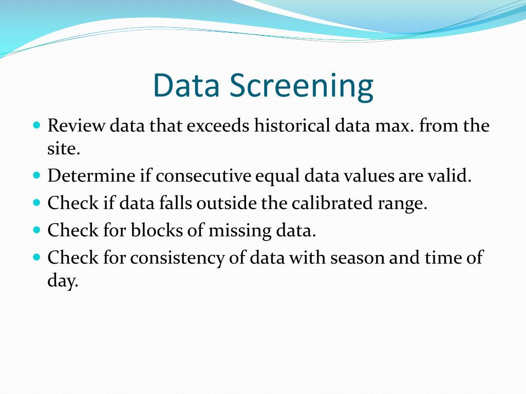 Data Screening • Review data that exceeds historical data max. from the site. • Determine if consecutive equal data values are valid. • Check if data falls outside the calibrated range. • Check for blocks of missing data. • Check for consistency of data with season and time of day.