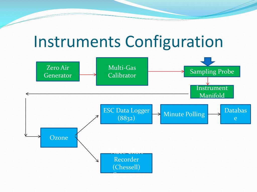 Instruments Configuration Multi-Gas Calibrator Zero Air Generator Sampling Probe Instrument Manifold ESC Data Logger (8832) Minute Polling Database Ozone Video Chart Recorder (Chessell) Generator