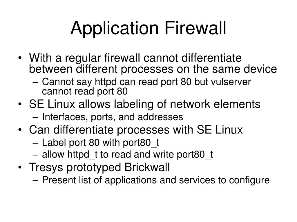 Application Firewall • With a regular firewall cannot differentiate between different processes on the same device • Cannot say httpd can read port 80 but vulserver cannot read port 80 • SE Linux allows labeling of network elements • Interfaces, ports, and addresses • Can differentiate processes with SE Linux • Label port 80 with port80_t • allow httpd_t to read and write port80_t • Tresys prototyped Brickwall • Present list of applications and services to configure