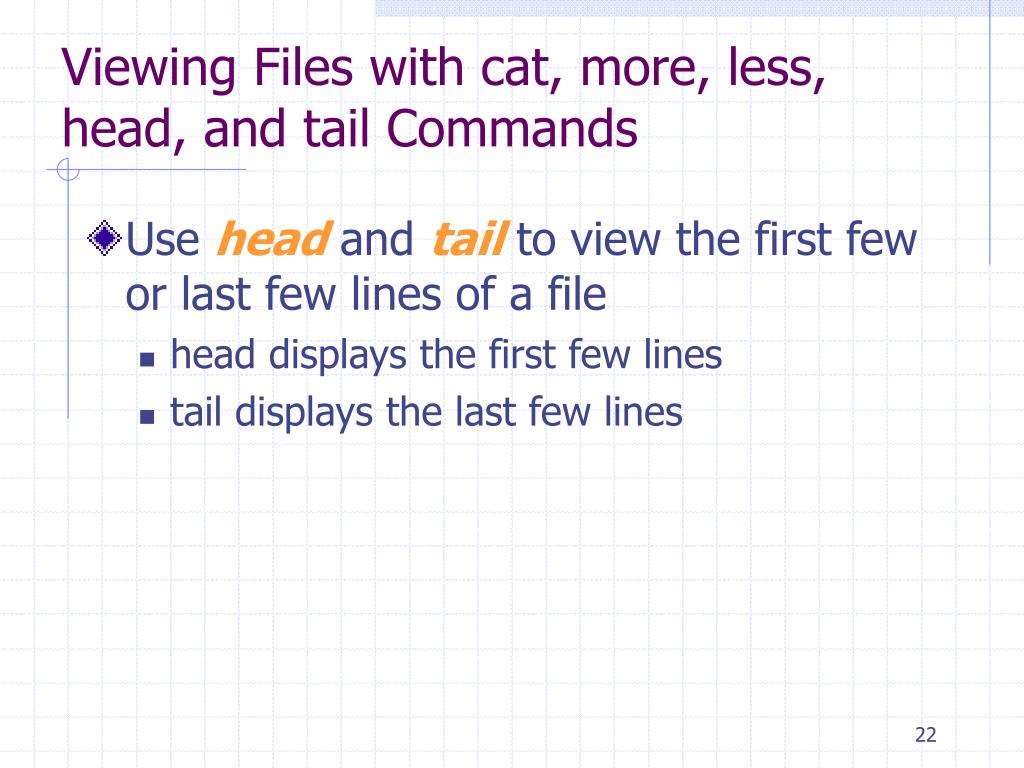 Viewing Files with cat, more, less, head, and tail Commands • Use head and tail to view the first few or last few lines of a file • head displays the first few lines • tail displays the last few lines