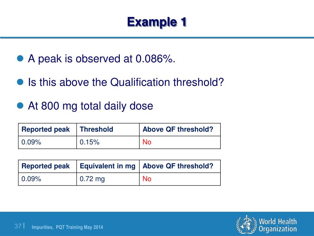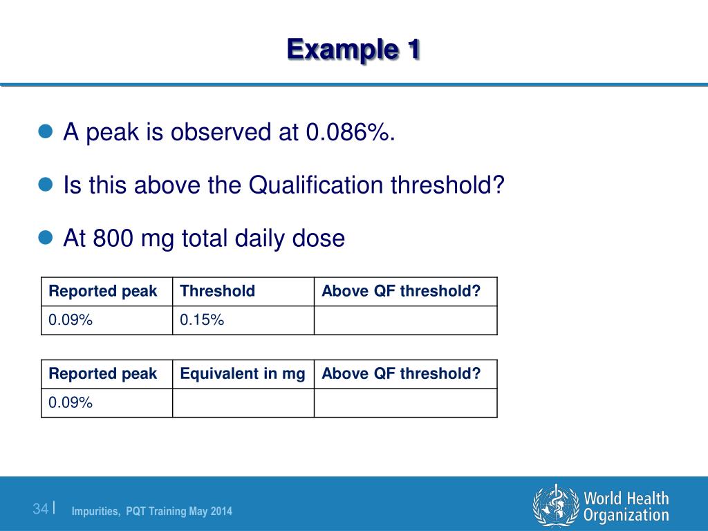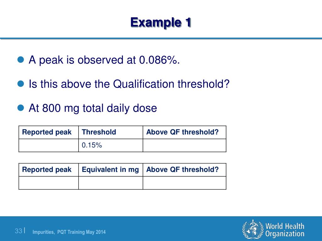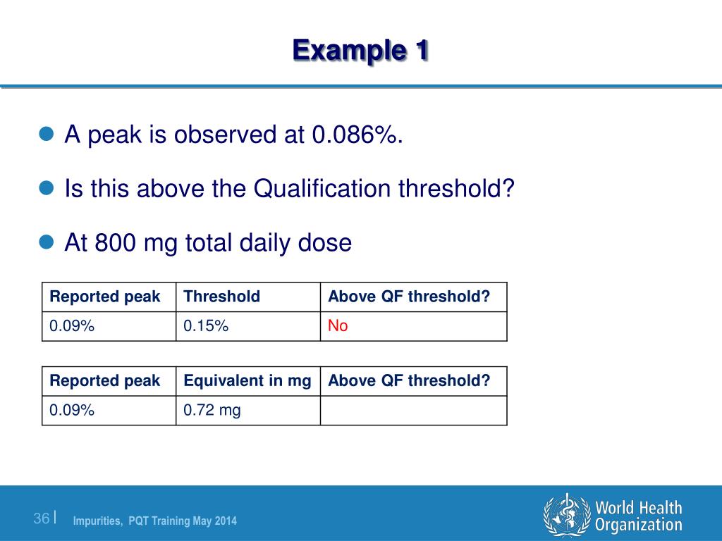 Example 1 • A peak is observed at 0.086%. • Is this above the Qualification threshold? • At 800 mg total daily dose