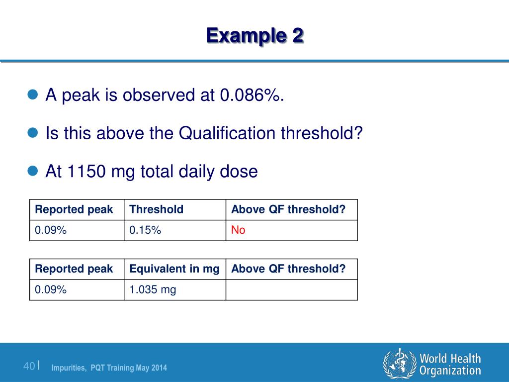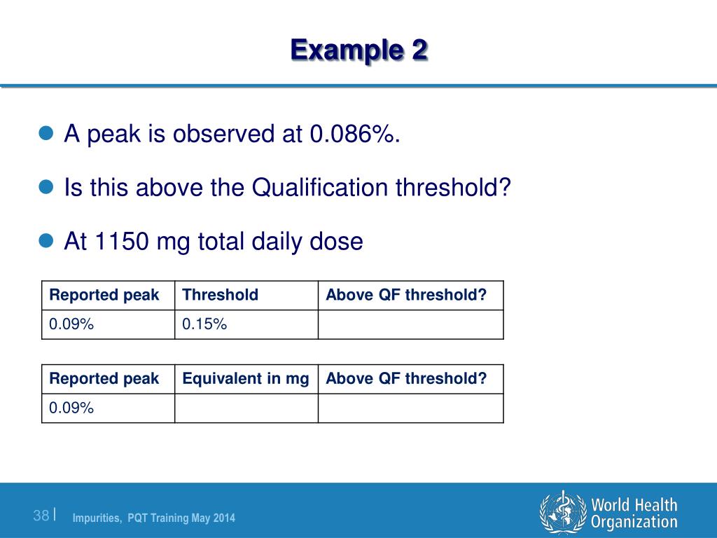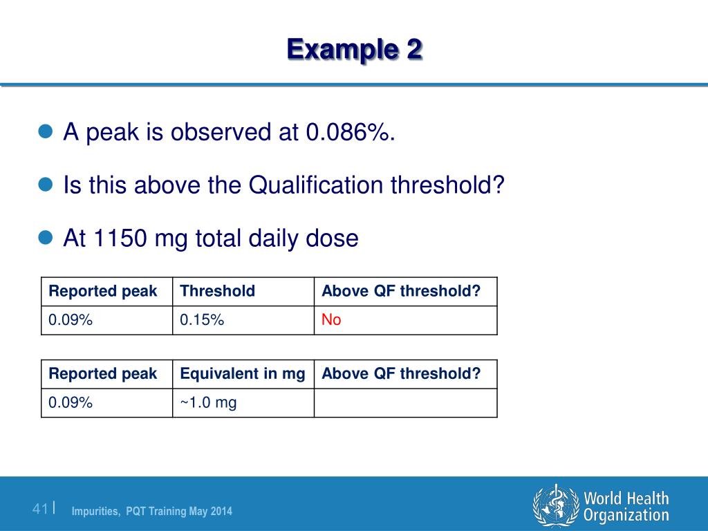 Example 2 • A peak is observed at 0.086%. • Is this above the Qualification threshold? • At 1150 mg total daily dose