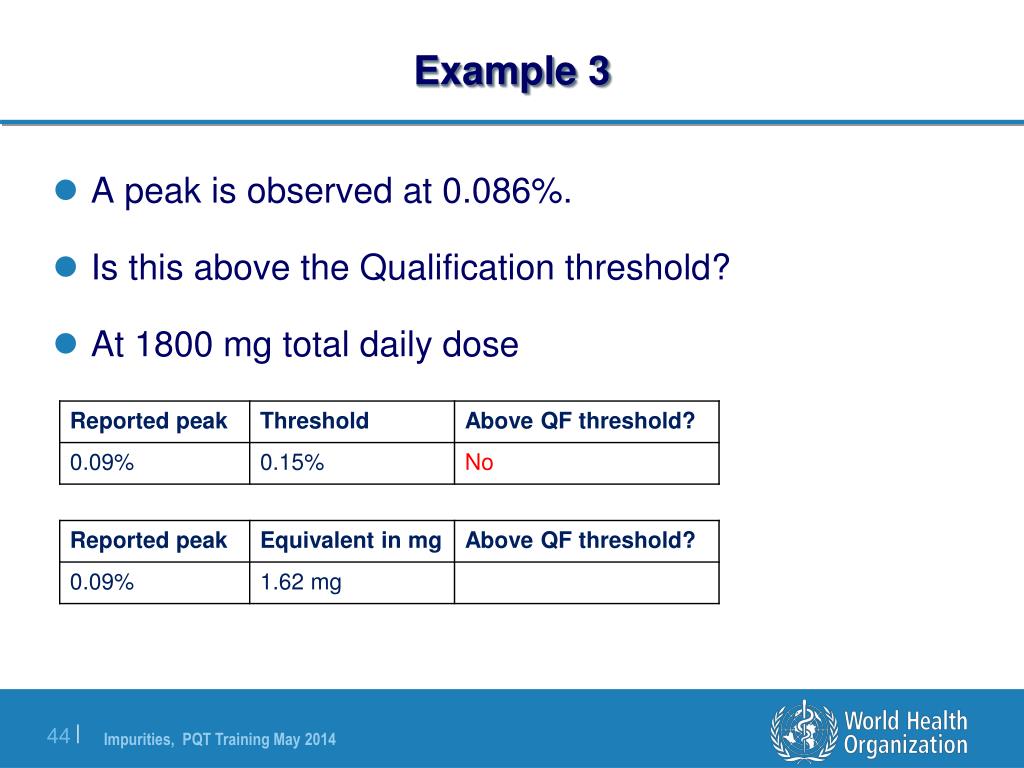 Example 3 • A peak is observed at 0.086%. • Is this above the Qualification threshold? • At 1800 mg total daily dose