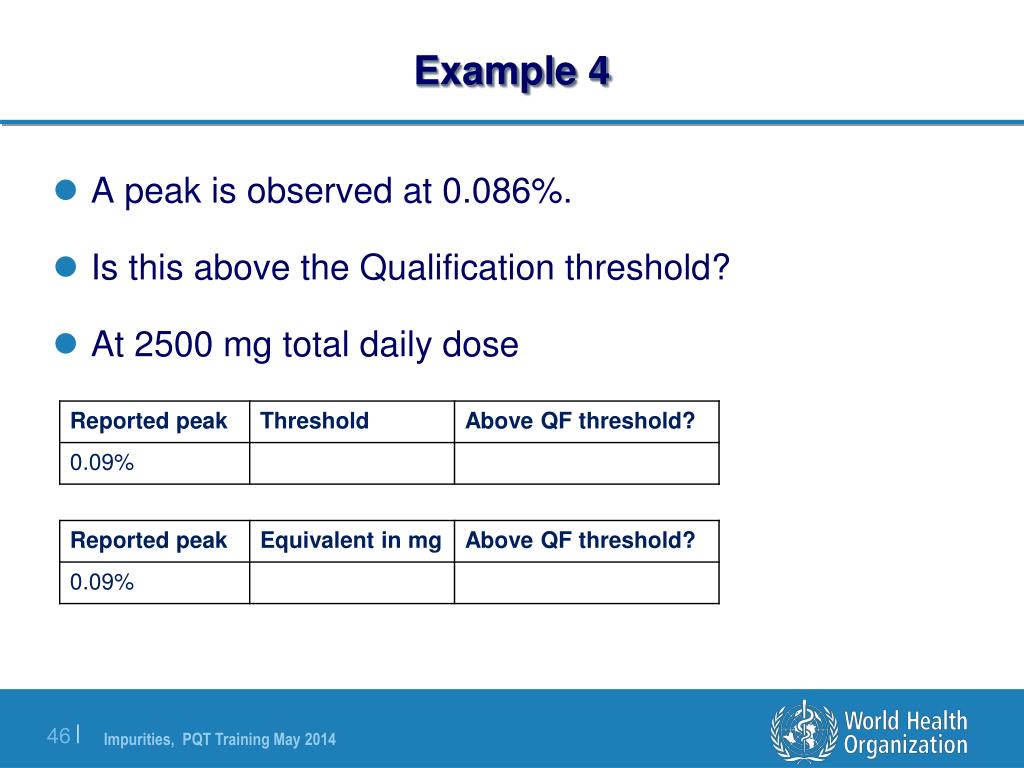 Example 4 • A peak is observed at 0.086%. • Is this above the Qualification threshold? • At 2500 mg total daily dose