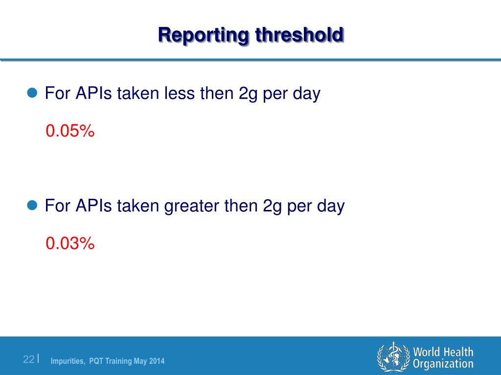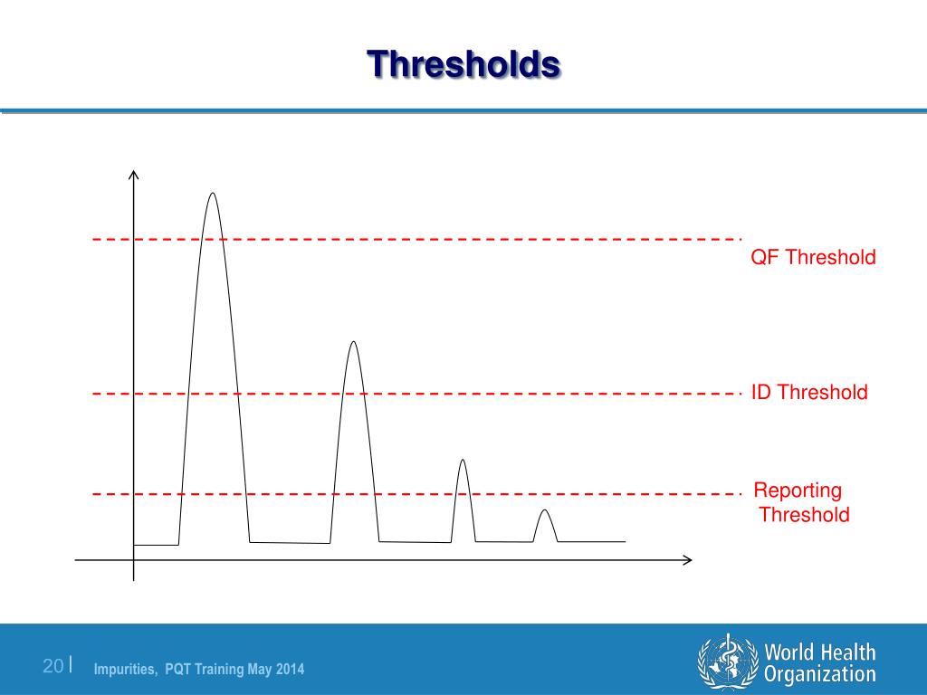 Thresholds and limits Thresholds • The ICH reporting, identification, and qualification thresholds indicate levels at which the applicant is expected to undertake increasing control of an impurity. Limits • In contrast an impurity limit is the non-negotiable allowable level for an impurity in a batch.