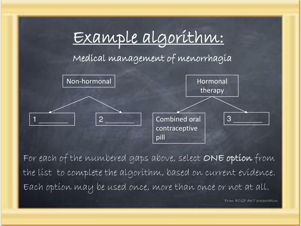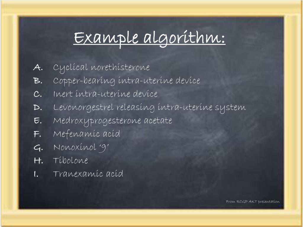 Example algorithm: From RCGP AKT presentation A. Cyclical norethisterone B. Copper-bearing intra-uterine device C. Inert intra-uterine device D.Levonorgestrel releasing intra-uterine system E.Medroxyprogesterone acetate F.Mefenamic acid G.Nonoxinol ‘9’ H.Tibolone I.Tranexamic acid