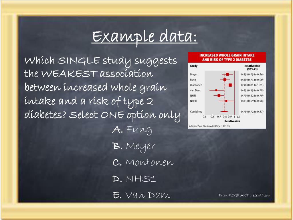 Example data: From RCGP AKT presentation Which SINGLE study suggests the WEAKEST association between increased whole grain intake and a risk of type 2 diabetes? Select ONE option only A.Fung B.Meyer C.Montonen D.NHS1 E.Van Dam