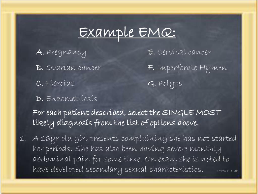 Example EMQ: A.Pregnancy B.Ovarian cancer C.Fibroids D.Endometriosis E.Cervical cancer F.Imperforate Hymen G.Polyps For each patient described, select the SINGLE MOST likely diagnosis from the list of options above. A 16yr old girl presents complaining she has not started her periods. She has also been having severe monthly abdominal pain for some time. On exam she is noted to have developed secondary sexual characteristics. I MADE IT UP