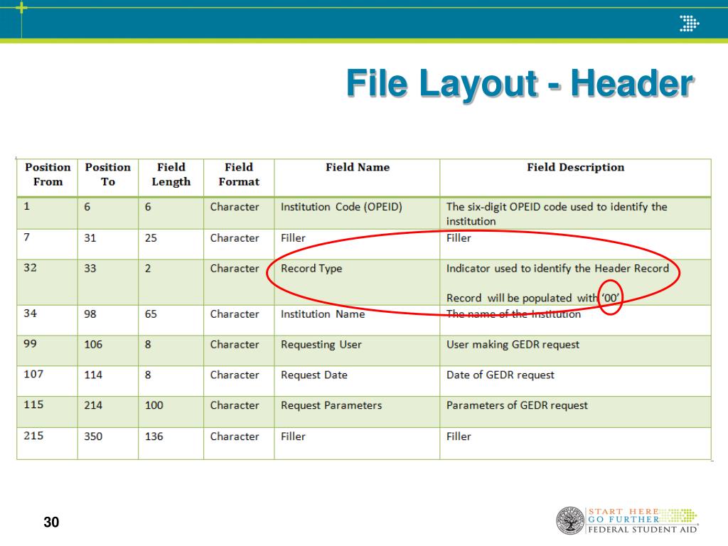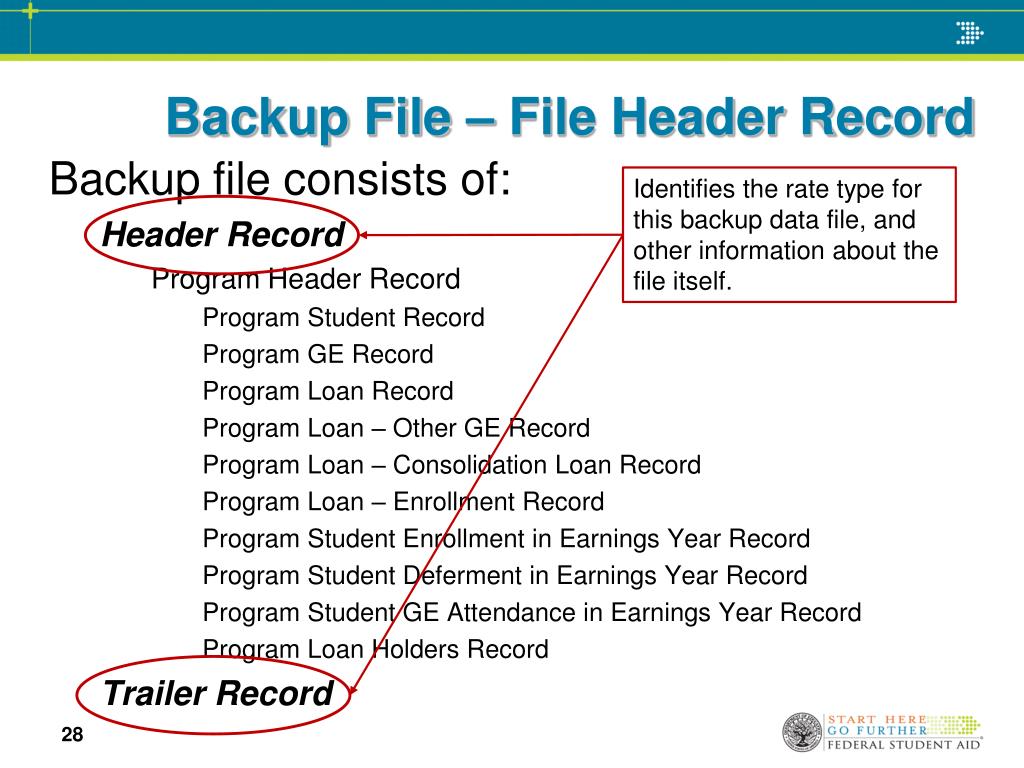 Backup File – File Header Record Identifies the rate type for this backup data file, and other information about the file itself. Backup file consists of: Header Record Program Header Record Program Student Record Program GE Record Program Loan Record Program Loan – Other GE Record Program Loan – Consolidation Loan Record Program Loan – Enrollment Record Program Student Enrollment in Earnings Year Record Program Student Deferment in Earnings Year Record Program Student GE Attendance in Earnings Year Record Program Loan Holders Record Trailer Record