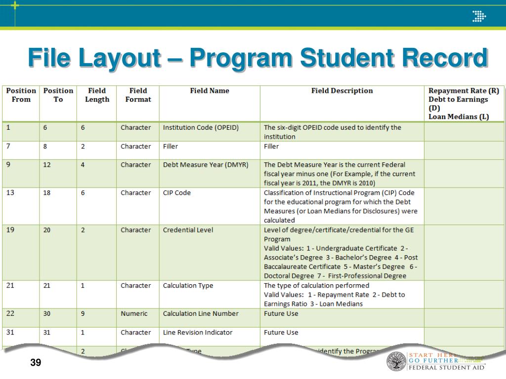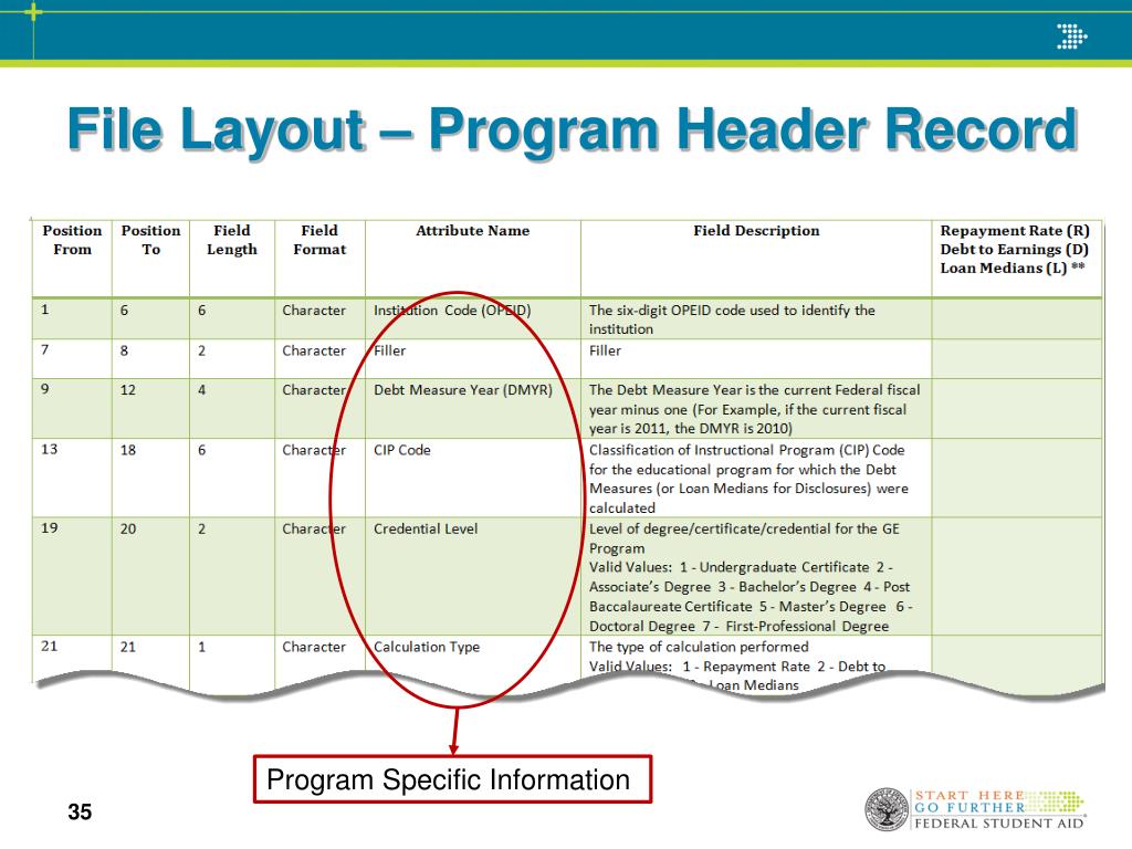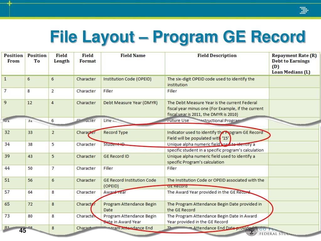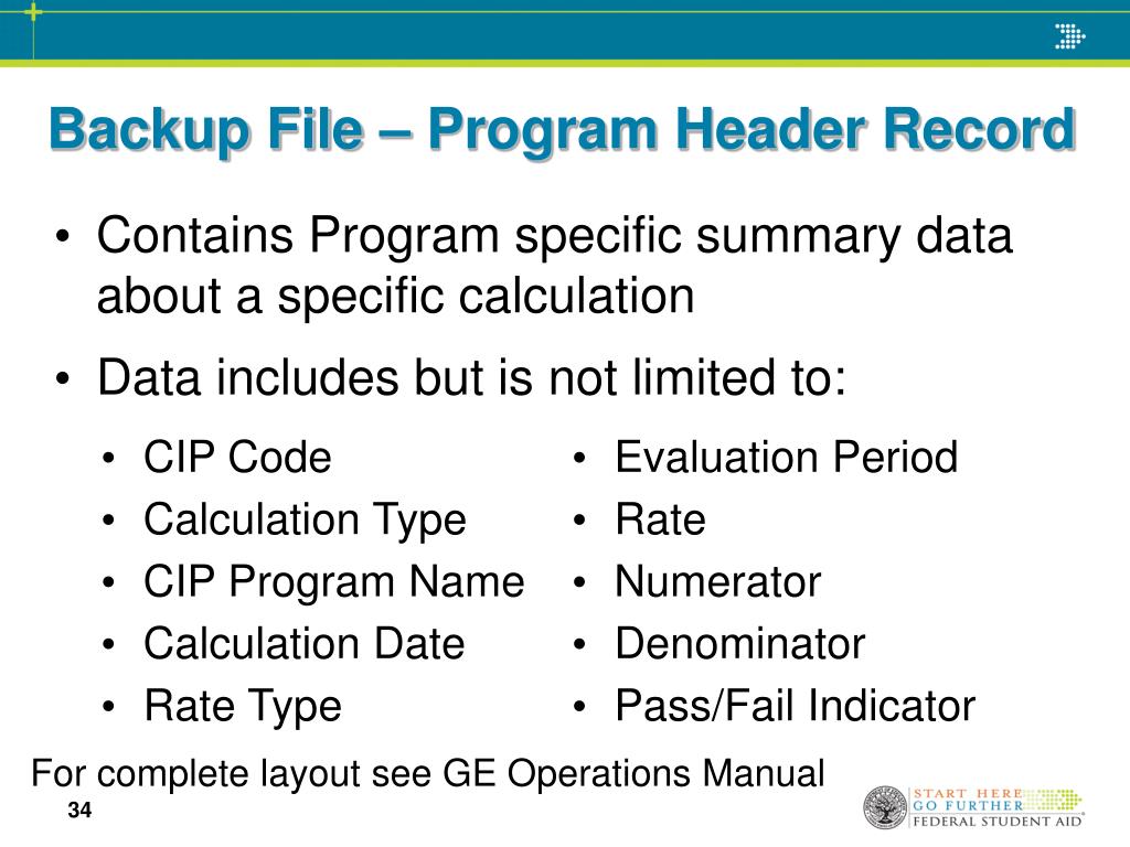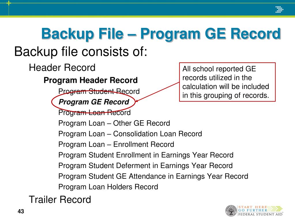 Backup File – Program GE Record All school reported GE records utilized in the calculation will be included in this grouping of records. Backup file consists of: Header Record Program Header Record Program Student Record Program GE Record Program Loan Record Program Loan – Other GE Record Program Loan – Consolidation Loan Record Program Loan – Enrollment Record Program Student Enrollment in Earnings Year Record Program Student Deferment in Earnings Year Record Program Student GE Attendance in Earnings Year Record Program Loan Holders Record Trailer Record