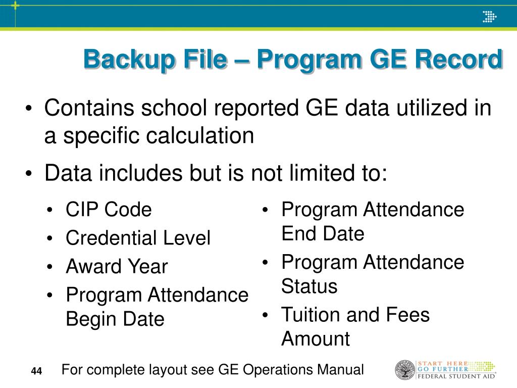 Backup File – Program GE Record • CIP Code • Credential Level • Award Year • Program Attendance Begin Date • Program Attendance End Date • Program Attendance Status • Tuition and Fees Amount For complete layout see GE Operations Manual Contains school reported GE data utilized in a specific calculation Data includes but is not limited to: