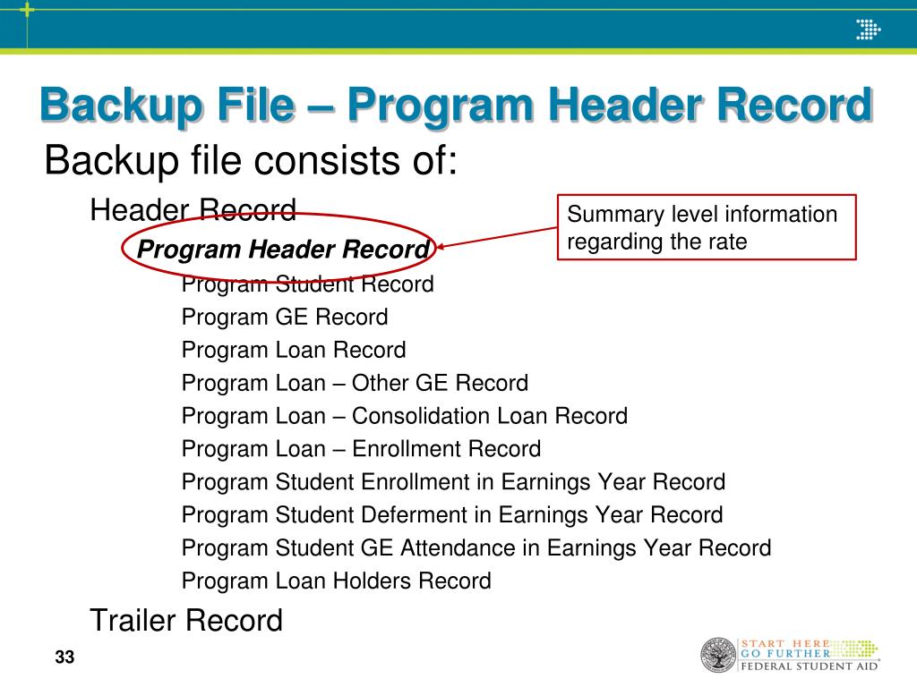 Backup File – Program Header Record Summary level information regarding the rate Backup file consists of: Header Record Program Header Record Program Student Record Program GE Record Program Loan Record Program Loan – Other GE Record Program Loan – Consolidation Loan Record Program Loan – Enrollment Record Program Student Enrollment in Earnings Year Record Program Student Deferment in Earnings Year Record Program Student GE Attendance in Earnings Year Record Program Loan Holders Record Trailer Record