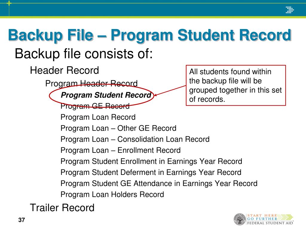 Backup File – Program Student Record All students found within the backup file will be grouped together in this set of records. Backup file consists of: Header Record Program Header Record Program Student Record Program GE Record Program Loan Record Program Loan – Other GE Record Program Loan – Consolidation Loan Record Program Loan – Enrollment Record Program Student Enrollment in Earnings Year Record Program Student Deferment in Earnings Year Record Program Student GE Attendance in Earnings Year Record Program Loan Holders Record Trailer Record