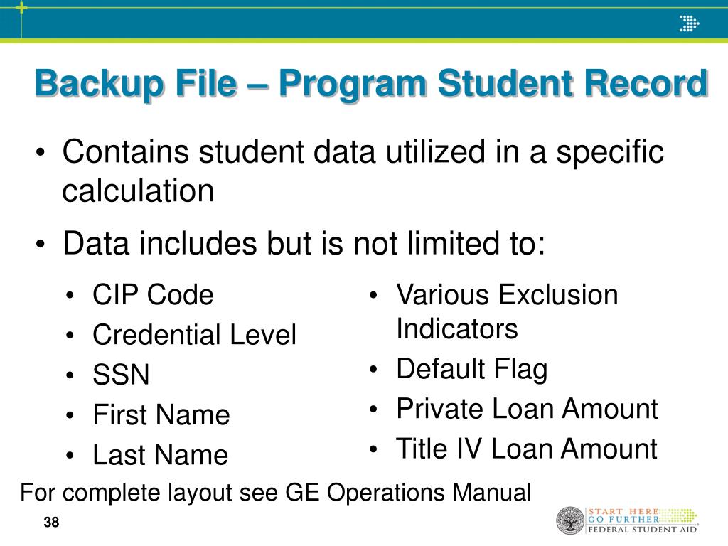 Backup File – Program Student Record • CIP Code • Credential Level • SSN • First Name • Last Name • Various Exclusion Indicators • Default Flag • Private Loan Amount • Title IV Loan Amount For complete layout see GE Operations Manual Contains student data utilized in a specific calculation Data includes but is not limited to: