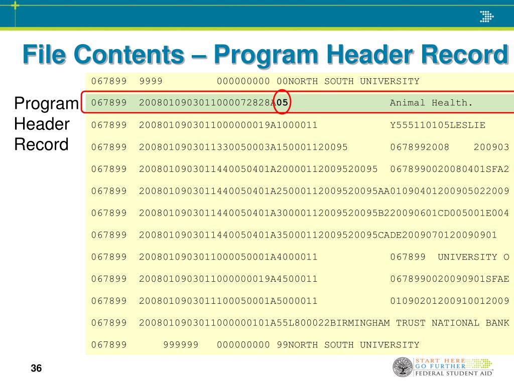 File Contents – Program Header Record Program Header Record 067899 2008010903011000072828A05 Animal Health. 067899 9999 000000000 00NORTH SOUTH UNIVERSITY 067899 2008010903011000072828A05 Animal Health. 067899 2008010903011000000019A1000011 Y555110105LESLIE 067899 2008010903011330050003A150001120095 0678992008 200903 067899 2008010903011440050401A20000112009520095 0678990020080401SFA2 067899 2008010903011440050401A25000112009520095AA01090401200905022009 067899 2008010903011440050401A30000112009520095B220090601CD005001E004 067899 2008010903011440050401A35000112009520095CADE2009070120090901 067899 2008010903011000050001A4000011 067899 UNIVERSITY O 067899 2008010903011000000019A4500011 0678990020090901SFAE 067899 2008010903011100050001A5000011 01090201200910012009 067899 2008010903011000000101A55L800022BIRMINGHAM TRUST NATIONAL BANK 067899 999999 000000000 99NORTH SOUTH UNIVERSITY