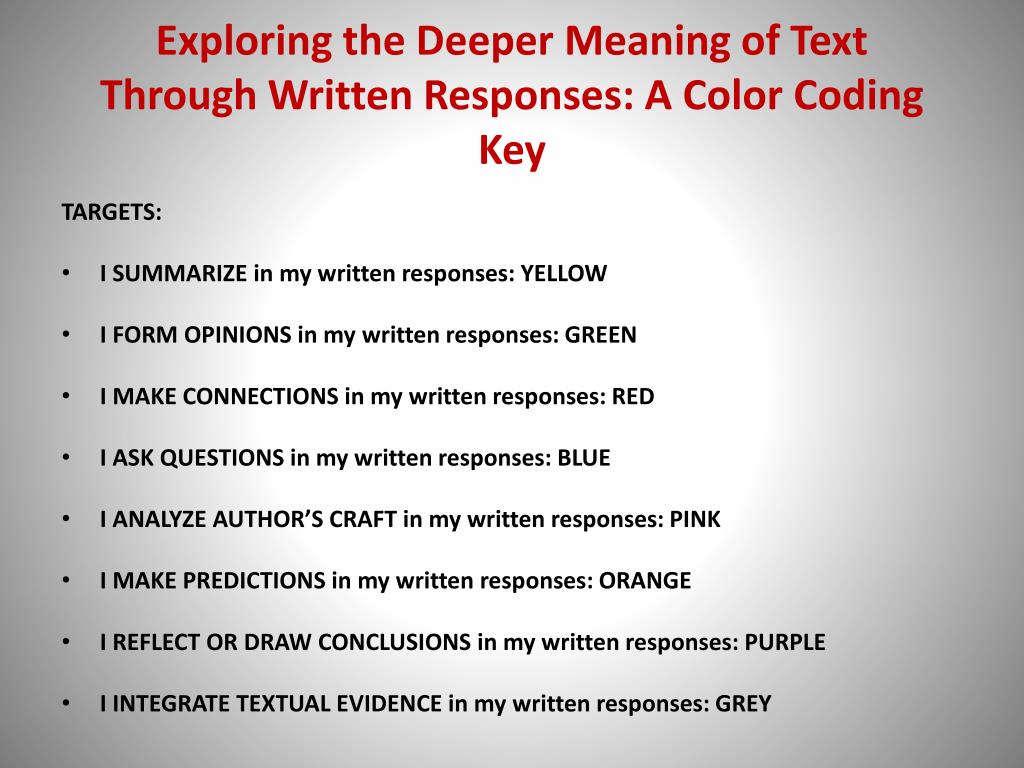 Exploring the Deeper Meaning of TextThrough Written Responses: A Color Coding Key TARGETS: • I SUMMARIZE in my written responses: YELLOW • I FORM OPINIONS in my written responses: GREEN • I MAKE CONNECTIONS in my written responses: RED • I ASK QUESTIONS in my written responses: BLUE • I ANALYZE AUTHOR’S CRAFT in my written responses: PINK • I MAKE PREDICTIONS in my written responses: ORANGE • I REFLECT OR DRAW CONCLUSIONS in my written responses: PURPLE • I INTEGRATE TEXTUAL EVIDENCE in my written responses: GREY